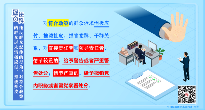 《中国共产党纪律处分条例》第一百二十六条对不作为、乱作为、慢作为、假作为等漠视、损害群众利益行为及其适用的处分种类和幅度作出了规定,其中第二项为“对符合政策的群众诉求消极应付、推诿扯皮,损害党群、干群关系”。有此违纪行为的,对直接责任者和领导责任者,情节较重的,给予警告或者严重警告处分;情节严重的,给予撤销党内职务或者留党察看处分。
